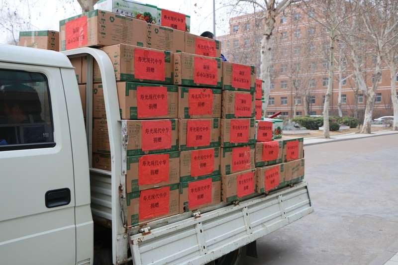 3月5日下午,两辆载满图书的货车缓缓驶出寿光现代中学的大门。车上共装216箱,合计36314本图书,这些图书将与寿光其他学校捐赠的书籍汇合,最终送到新疆新疆喀什地区麦盖提县的中小学生手中。
