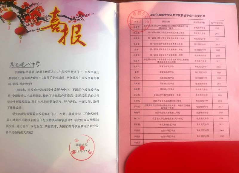 近日,在聊城大学年终评奖评优中,寿光现代中学共有21人次获得国家励志奖学金及各类奥赛奖项。为此,聊城大学特向我校发来喜报,感谢寿光现代中学多年来一直为其输送优秀学生,对寿光现代中学的辛勤培育表示衷心感谢!