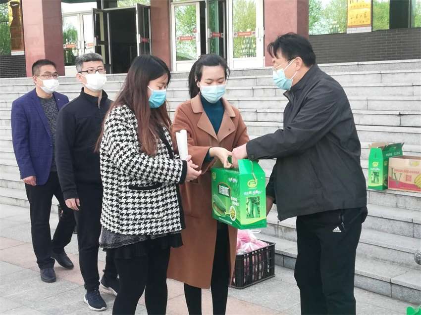 学校实行封闭管理,老师们的在校生活状况和需求成为学校党委的牵挂。为改善在校教职工的日常生活,4月21日下午,现代苑广场,暖心场景再现,学校校长、党委书记孙安源现场调度,学校副校长赵国田,党委委员、高三年级负责人张法国代表学校党委把一箱箱装满香蕉、苹果、甜瓜的“爱心”水果送到每一位参与高三教育教学管理工作的职员工手中,以表达学校党委对他们为学校兢兢业业工作的感谢。
