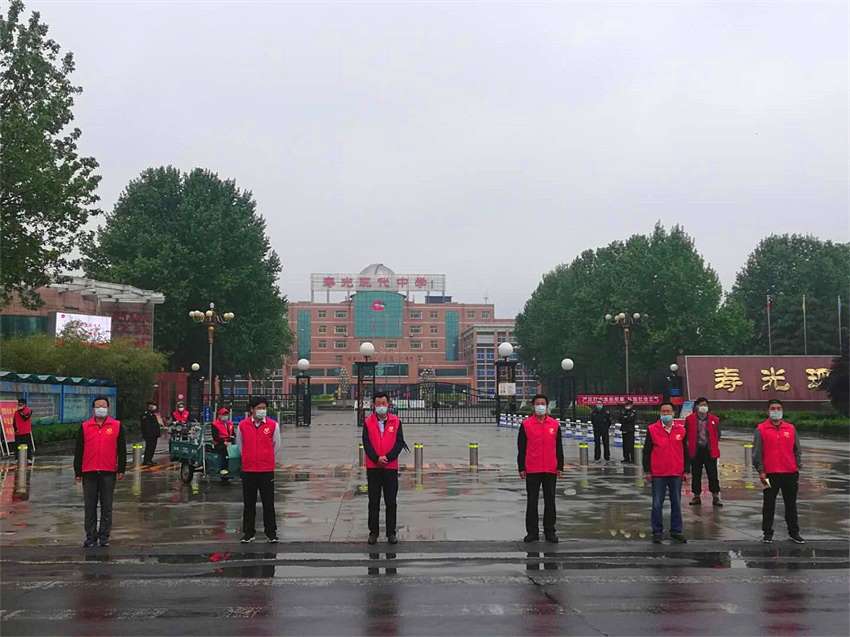 早晨七点,寿光现代中学东大门早已规范站满了迎接学生家长送物品的“现代红”教职工志愿者。