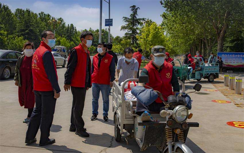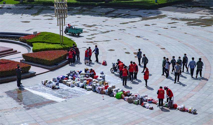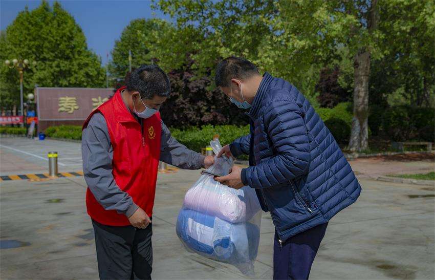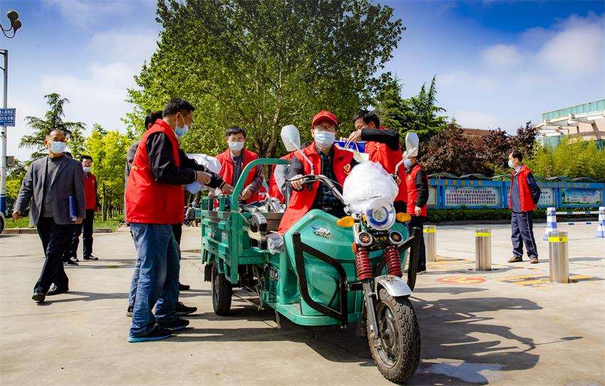 七点二十分许,陆续有家长或驾车,或开三轮,或步行到校给学生送东西。“现代红”教职工志愿者们,微笑着接过家长送来的物品,热情的打着招呼,“谢谢,你们辛苦了!”“不客气,请您放心!”“有事及时跟学校和班主任联系”,一边辨识着塑料袋或纸箱或行李箱上的标注,若有不全的,随手标注完整,然后轻轻的放在等候的电动三轮车上,喷酒精消毒并运到现代苑广场指定的班级物品存放点。存放点的志愿者们按班级顺序整齐地摆放,认真的登记、分拣,等候集齐分发到学生手里。