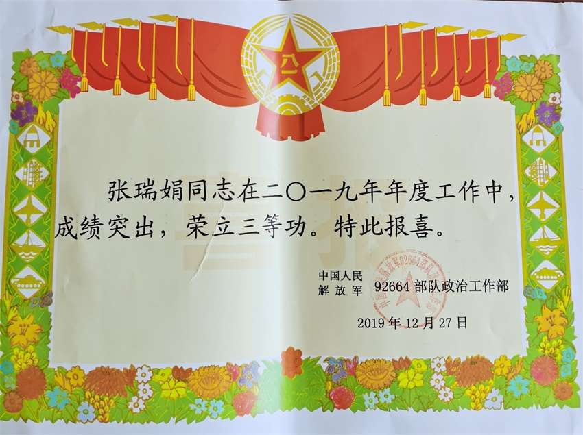 近日,寿光现代中学收到中国人民解放军某部队发来的贺信:寿光现代中学培养的学生张瑞娟,在2019年度工作中成绩突出,给予三等功奖励。