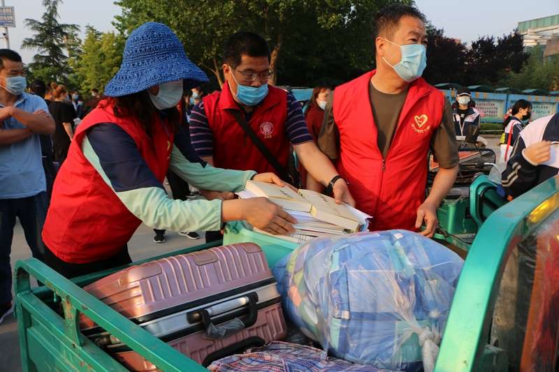 金海路西侧南北行道上,志愿行李组老师们面带微笑帮着学生从私家车上搬下行李,志愿老师成了“搬运工”“勤务员”,老师们用实际行动诠释了“暖心助人,奉献为民”的志愿口号,成为了一道特别的风景。不时有细声问候,传递着浓浓的师生情谊,并引导着学生有序进入入校测温通道。