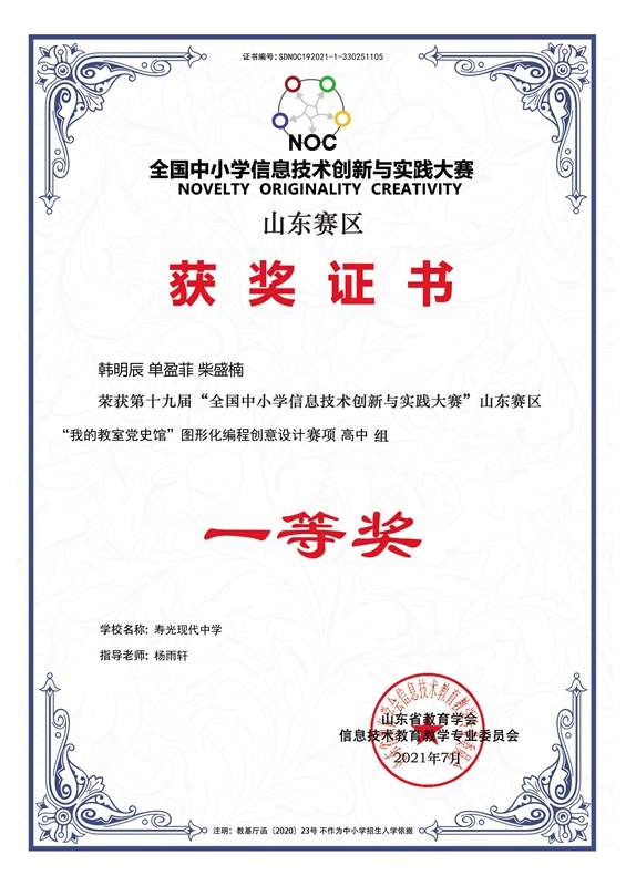 在近两年的信息技术类竞赛中,现代少年火力全开,斩获多项省级、国家级信息技术类竞赛大奖。除以上2021年取得的优异成绩以外,2020年信息技术类竞赛也取得优异成绩:刘明睿同学获信息学奥赛(csp2020)提高组一等奖;杨子涵和冯浩洋两名同学作为潍坊市NOC大赛唯一一支高中队伍代表山东省挺进国赛,获得国家级二等奖的优秀成绩。学校取得的成绩在整个山东赛区遥遥领先,在全国范围名列前茅!