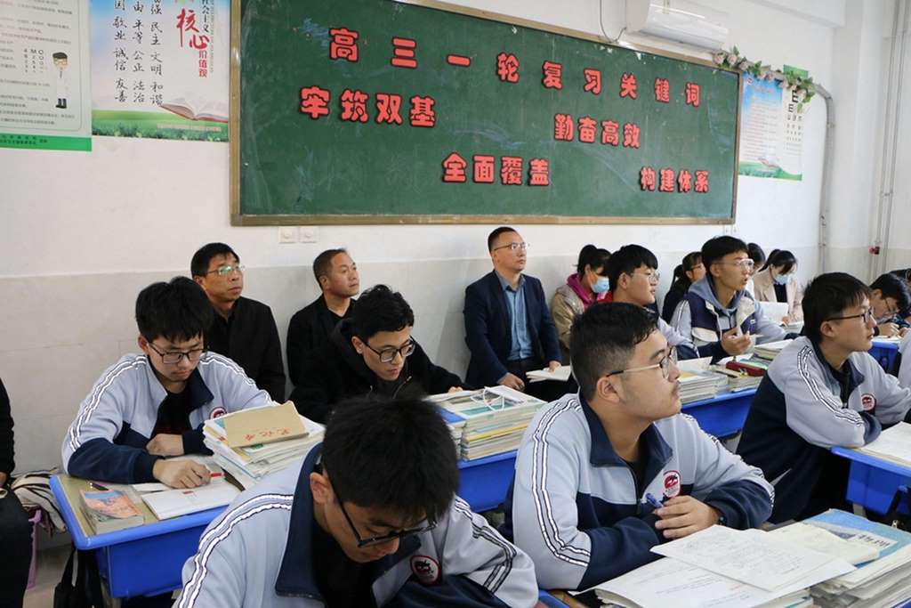 在会议室,学校副校长张建波以“精雕细刻抓管理 凝心聚力抓教学”为题,从推进高效课堂、探索优生优培、建设和谐校园、打造一流教师队伍等方面,向视导组做了高三备考工作汇报。他分析了当前高考备考中存在的不足、应对措施以及未来备考工作展望,热切希望视导组给高三精准“诊脉”,开出“良方”。