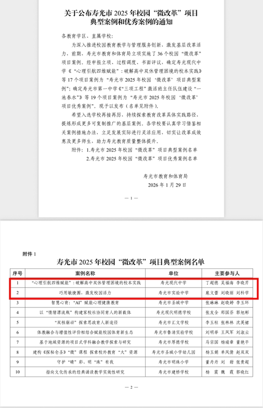 近日,寿光市2025年校园“微改革”项目典型案例评选结果揭晓。经申报立项、过程跟踪与专家评议,我校申报的《“心理引航四维赋能”:破解高中双休管理困境的校本实践》项目,从全市36个立项案例中脱颖而出,荣获一等奖。