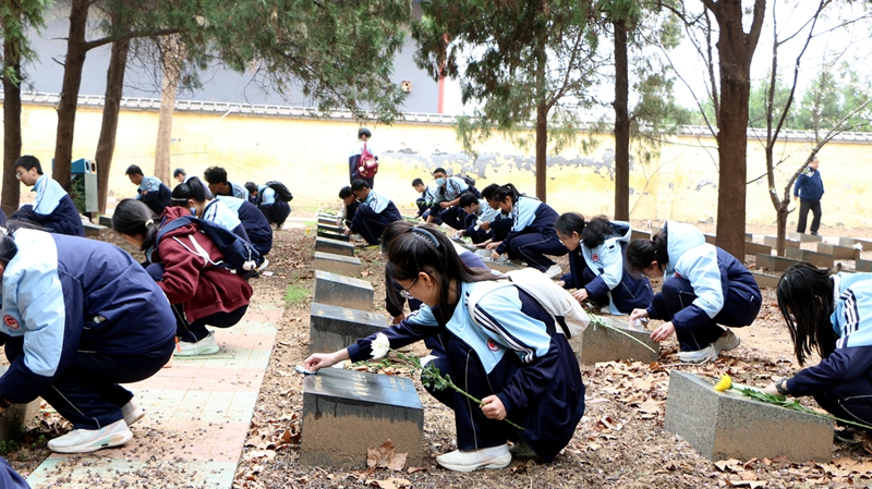 陵园内,松柏苍翠,哀思绵绵。祭扫仪式在庄严的国歌声中开启,全体师生整齐列队,奏唱国歌,向革命先烈致敬。随后,学生代表缓步上前,向烈士纪念碑敬献花圈,寄托无限缅怀之情。全体师生低头默哀一分钟,以无声的哀思,致敬先烈们为民族独立、人民解放事业抛头颅、洒热血的英勇壮举。