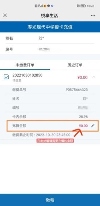 2、进入悦享生活“寿光现代中学餐卡充值”页面,输入学生姓名和编号(餐卡号)--查询—编辑“充值金额”(下方铅笔处)输入需要充值的金额,点击缴费,进入建行支付页面。(如下图)
